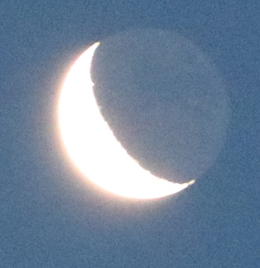 Eppure il giorno dopo mi sono svegliato fresco e riposato poco dopo le cinque del mattino, sono andato in ufficio, ho aperto la tapparella e la finestra del terrazzino e mi sono trovato di fronte la falce di Luna che era appena sorta ad est e ho scattato e il risultato è stato stranissimo, tanto che ho mandato la foto ad un amico scienziato che mi ha risposto :"certo, sei riuscito a riprendere la luce cinerea della Luna che permette di intravedere la parte oscurata della superficie grazie alla luce del Sole riflessa dalla Terra".