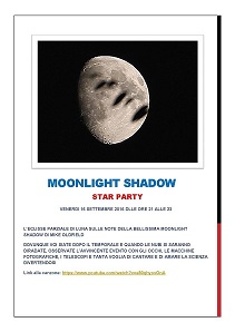 Venerdì sera 16 settembre 2016 ci sarà una eclisse parziale di Luna, provocata dall'ombra della Terra. Il nostro piccolo gruppo di astrofili, tutti contenti dell'occasione, aveva deciso di proporre un luogo di incontro dove i curiosi, o chi ha una macchina fotografica o un telescopio potessero ritrovarsi per osservare il fenomeno.