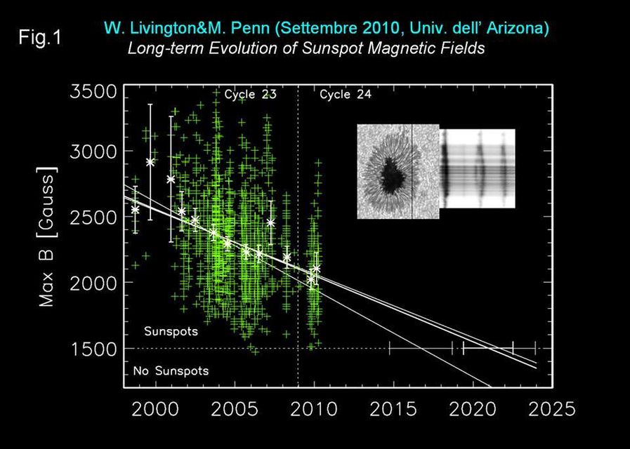 A metà serata un brivido di gelo ha percorso la sala, il relatore ha mostrato un grafico che potrebbe far supporre che l'attività solare si troverà presto nei dintorni della quiete e che teoricamente si stanno per ripetere le condizioni che hanno provocato sulla Terra una miniglaciazione tra il 1645 e il 1715. Se si supererà un determinato limite di diminuzione del campo magnetico che non consentirà neppure la formazione delle macchie solari, il fenomeno potrebbe iniziare a farsi sentire sul nostro pianeta tra il 2018 e il 2020. Con somma gioia dei miei sci Rossignol S7 gialli.